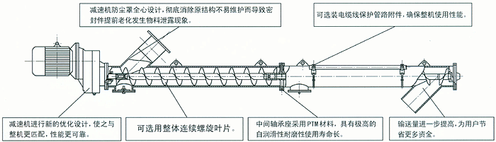 例:炭黑、純堿、水泥、化肥、農(nóng)藥、面粉糧食等。 性能特點(diǎn)一高效率的輸送:小直徑、高轉(zhuǎn)速、變螺距的螺旋體設(shè)計(jì),確保產(chǎn)品在工作過(guò)程中順暢、快速、均勻上料。一隨意的布置:輸送機(jī)的外殼采用優(yōu)質(zhì)無(wú)縫鋼管通過(guò)法蘭名段連接為整體,故整體剛性好,無(wú)論是水平,還是大傾角均可連續(xù)輸送,并可直接與其配套的設(shè)備連接固定,無(wú)需地基基礎(chǔ),充分利用空間,移動(dòng)、拆裝十分方便。一良好的潤(rùn)滑:本公司專(zhuān)有PTM材料少油潤(rùn)滑滑動(dòng)瓦加多層迷宮式油封設(shè)計(jì)以及由油泵,分配器,管路形成的集中潤(rùn)滑系統(tǒng),使整機(jī)各運(yùn)動(dòng)付得到充分潤(rùn)滑,從而延長(zhǎng)了整機(jī)的使用壽命。雙重保護(hù),自然更勝一籌。一可靠的密封:潤(rùn)滑密封可靠無(wú)滲漏,既無(wú)浪費(fèi)物料,又創(chuàng)造了良好的工作環(huán)境,經(jīng)改良的窺視孔裝置無(wú)滲水和物料泄漏之憂(yōu)。歷經(jīng)風(fēng)雨侵襲卻連續(xù)工作,且少有故障發(fā)生。一多元化的聯(lián)接:進(jìn)、出料口可采用萬(wàn)向節(jié)、布袋、法蘭聯(lián)接方式。