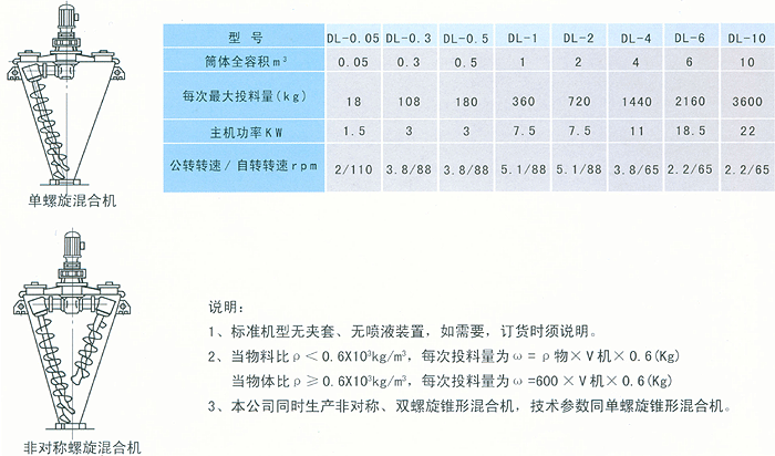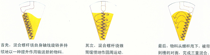 一食品工業(yè):小麥粉、谷物、奶粉、香料、咖啡、味精、食鹽等的混合物。一干燥行業(yè):粉料的干燥。一化工工業(yè):藥品、化妝品、洗滌劑、涂料、樹酯、玻璃硅、顏料、塑料、添加劑等行業(yè)的混合。 性能特點 一該機適用于固(粉)—固(粉)(粉體粒度300~2000um)混合及固(粉)—液(含液量<15%)的混合,特殊的夾套裝置,還可作為干燥設(shè)備使用。一獨有的雙級雙軸輸出的減速機,使本機結(jié)構(gòu)緊湊,外型美觀,操作方便;一錐形簡體以恰到好處的錐度確保物料流動形式及方便迅速出料,無滯留;一設(shè)備內(nèi)部結(jié)構(gòu)設(shè)計匠心獨具,始終保證單螺旋產(chǎn)品運行可靠,維護方便;一混合速度快,一般粉體混合只需10分鐘左右;一手動、電動、氣動出料方式供你選用。