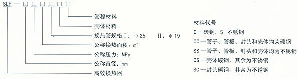 如公稱直徑為300,公稱壓力為1.0MPa,換熱面積為9m2,換熱管規(guī)格為ф19,材質:殼體為碳鋼,其余為不銹鋼的高效換熱器,其型號表示為:H300-1.0—911—CS