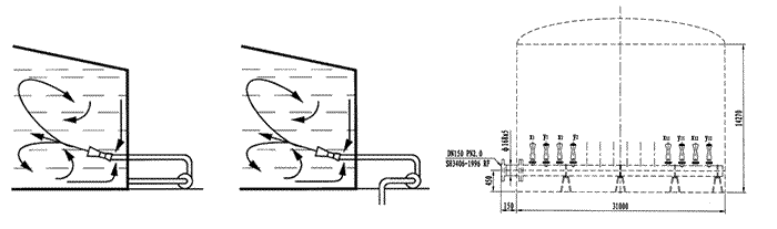PSG系列罐用噴射式混合器適用范圍廣闊,作為一個(gè)依據(jù),可以說(shuō),只要用離心泵可以傳送翻轉(zhuǎn)液體,就可以用這種混合器。主要用于容器、貯存罐和中和池,如油品調(diào)合,酸堿中和反應(yīng)等工藝,實(shí)為理想的混合設(shè)備。 PSG系列罐用噴射式混合器,在大型貯存罐中的作用尤為顯著,其安裝方位如圖所示。